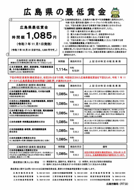 その他のお知らせ · 2025/10/01 最低賃金改正のお知らせ 広島県最低賃金は令和7年11月1日から時間額「1,085円」です。 また、最低賃金引上げの支援策として、「業務改善助成金」「キャリアアップ助成金」等があります。 詳細は、下記HPにてご確認下さい。 広島労働局 広島県の最低賃金について tagPlaceholderカテゴリ: