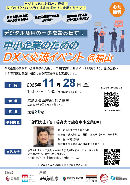 広島県DX推進コミュニティ事務局から「中小企業のためのDX×交流イベント(第3回@福山)」のご案内です。